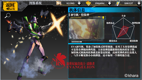 几十种不同装备外形的机甲,拥有其不同的战斗能力和技能,强袭、盾装、狙击、特攻、投掷、暴走等各种不同类型的特性应有尽有,玩家可以选择自己喜欢的或者认为最强的EVA进行作战,在战场上将再现原着中最具视觉冲击力的突击模式。