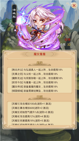 例如《羞羞的魔女》的女一号魔女羞羞,其羁绊与多名伙伴相关,如义杭、义杭、弘道真人等,激发羁绊属性可使得羁绊双方的攻击力、生命值等都有所提升(详见游戏内注释)。