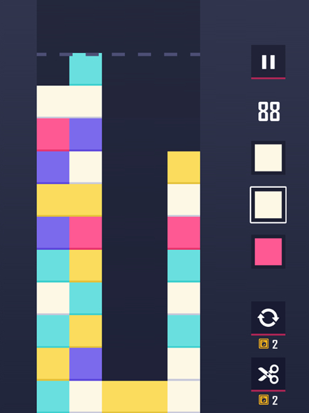 游戏的操作也很简单,相信接触过消除类玩家都会很容易上手该作。从右侧的色块中选择其中之一进行填充,即使该处原先有色块也会被填充更换。游戏最终目的就是三消,相比其他消除游戏,在操作上会更直接,填充三个色块即可达成消除目的。