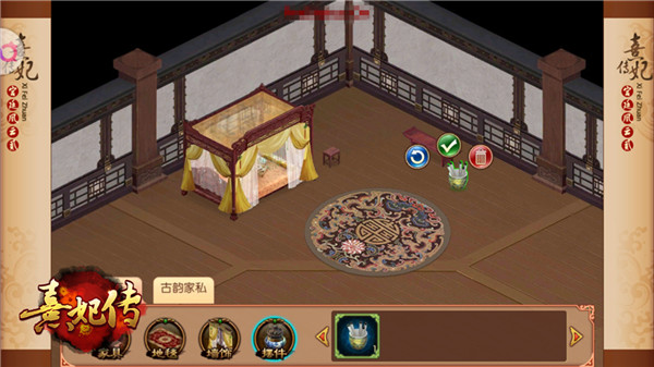 小主们首先需要了解的是“布置”与“打造”这两个功能。“打造”为建造家具之处,小主们可根据自己的官品,使用不同数量的红木与家具图纸来建造你想要的家具。而“布置”功能则是将已有的家具,随心布置在屋内,使原本空无一物的房间焕然一新。除了“打造”之外,家具还可通过购买途径直接获得。不论是打造所得还是购买所得,每个家具都带有繁荣值,将其放置进屋内会增加家园整体的繁荣值。当家园达到了一定繁荣值后,就会激活对应的宫斗属性加成。