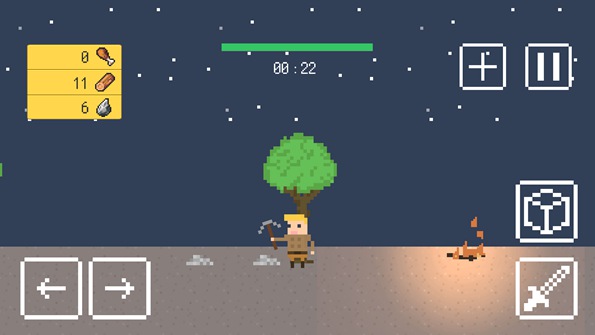 一开始就有教程,按左右键进行移动,并且右下角和右上角各有不同的功能按键。角色走到树木附近就会自动伐木,同理走到矿石附近就自动采矿。不过如果野狼来攻击了,就按下右下角攻击键,角色会不断进行攻击反抗。